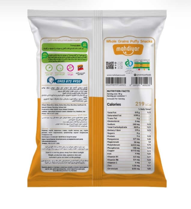 ترکیبات:گندم،سبوس گندم،جو،سبوس جو،برنج،سبوس برنج،روغن آفتابگردان،طعم دهنده طبیعی پنیری،نمک تصفیه شده